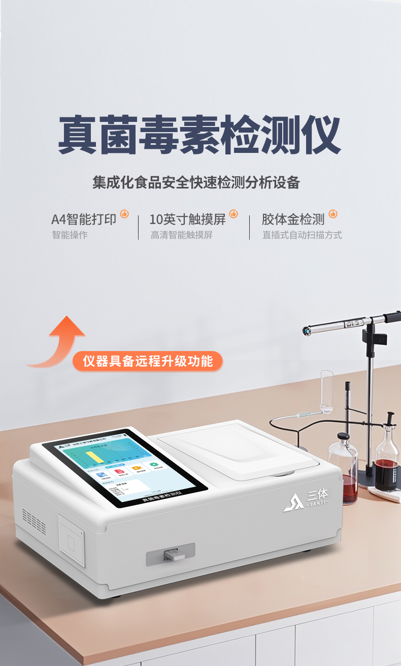 山东三体仪器有限公司生产的真菌毒素检测仪应用竞争抑制免疫层析的技术原理,通过就是通过待检测物与抗体结合的方法,分析待检样品中真菌毒素残留。可快速检测粮食、饲料、谷物、食用油、调味品中如玉米、大米、小麦、大麦、糙米、麸皮、稻谷、豆粕、米糠、饲料中的黄曲霉毒素B1、M1、总量,玉米赤霉烯酮、呕吐毒素、T2毒素、赭曲霉毒素、伏马毒素等。