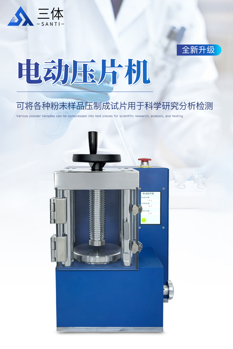 电动压片机该机相比手动压片机,工作效率大大提高,4.3寸触摸液晶屏直接显示压力吨位;配以特定模具,可将各种粉末样品压制成试片用于科学研究分析检测等,也可作为普通压力机使用,应用极其广泛。
