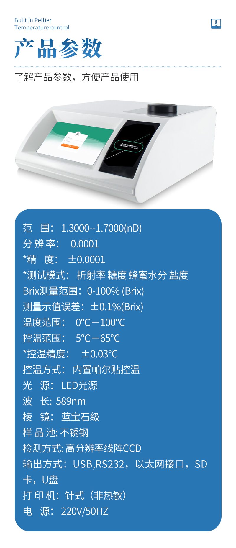 ST-ZG系列全自动折光仪配备高性能线阵CCD感光部件,通过高速、高精度的信号采集和分析处理技术,配有半导体帕尔贴超级温度控制系统。能高效、高**测量透明、半透明、深色、粘稠状等各类液体的折射率(nD)和糖溶液的质量分数(Brix)。